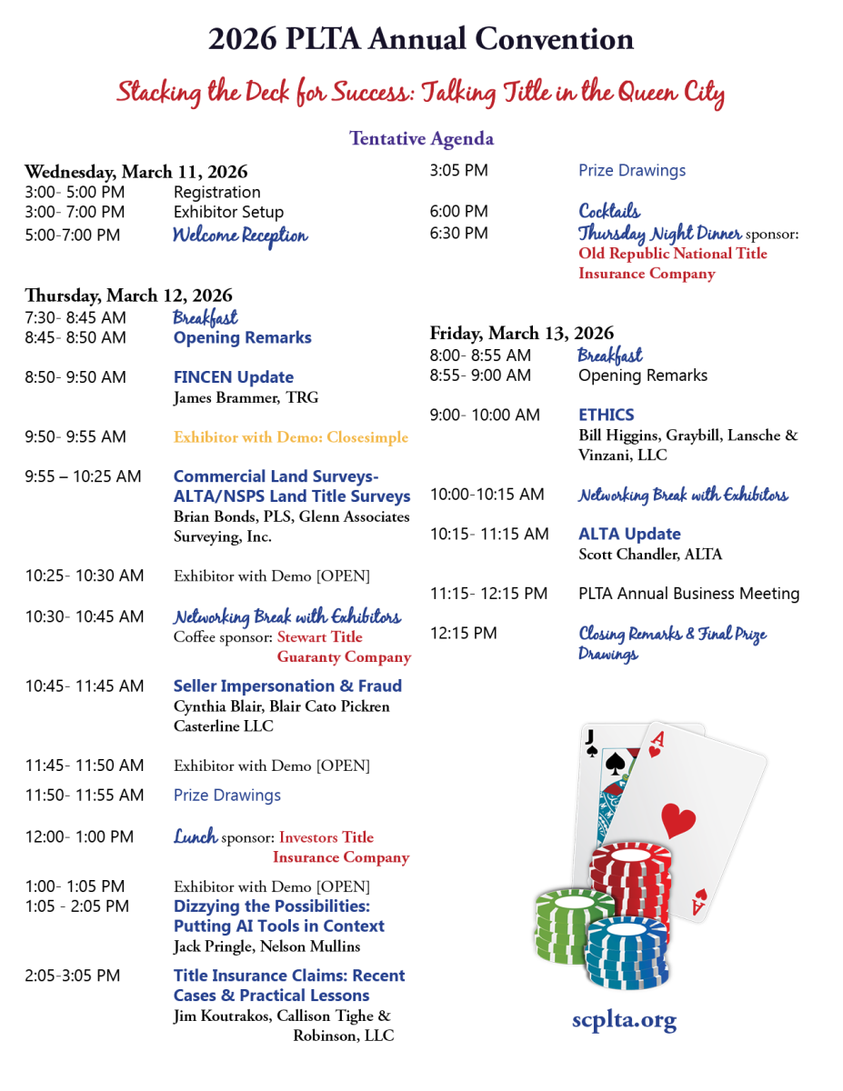 We are excited to invite you to partner with us at the 2026 PLTA Annual Convention, taking place March 11–13, 2026 at the Embassy Suites in Charlotte, NC. This year’s event will bring together South Carolina’s title professionals for three days of education, networking, and industry updates—and it’s the perfect opportunity to showcase your organization.